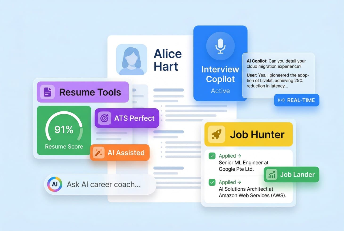 Copilot, resume builder, and job hunter—one stack so you can practice, polish, and apply without switching tabs.